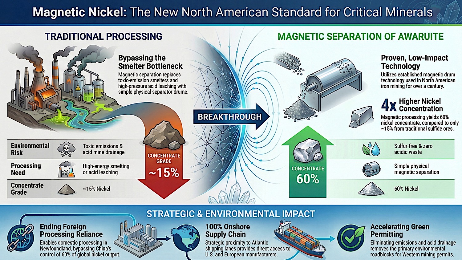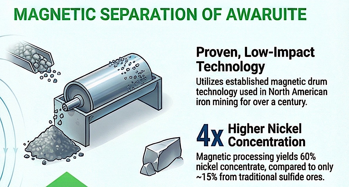 It is this fundamental metallurgy that dictates its revolutionary processing path. Because awaruite is naturally magnetic, it can be concentrated using simple, low-tech magnetic separators. This is the same technology used in North American iron ore operations for over a century. The process eliminates the need for the energy-intensive, high-emission smelting step required to break the chemical bonds in sulfides, or the high-pressure acid leaching (HPAL) used for laterites.